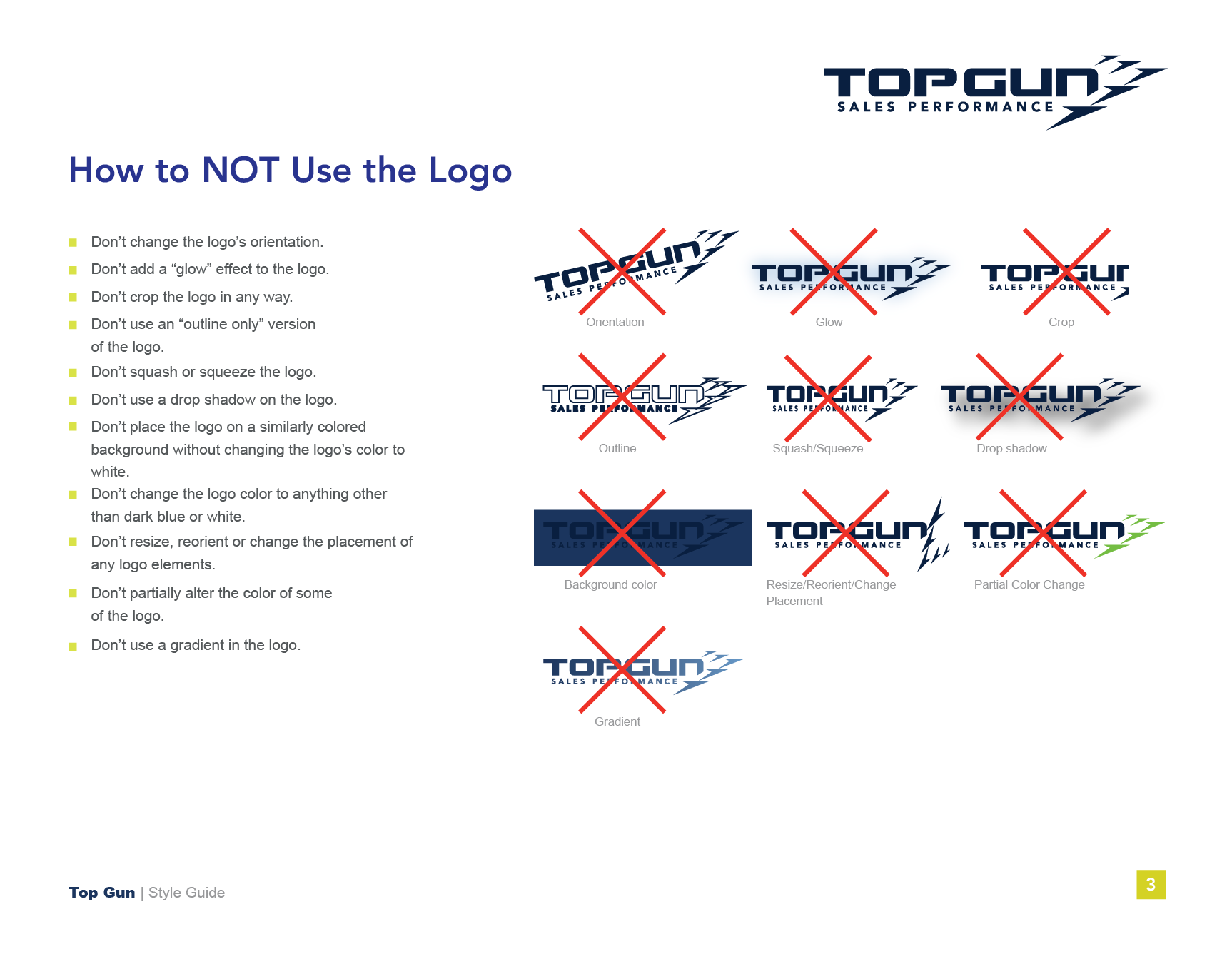 The Top Gun Sales Performance(TGSP) brand is based on the US Navy’s Advanced Weapons and Tactics School, Topgun. It’s where the Navy trains its top pilots and it’s not a place for the faint of heart. The performance standard: perfection. The training is exhaustive, combining intensive learning with hours of flight time perfecting skills and techniques. There’s much TGSP seeks to emulate in the brand: the pursuit of perfection, the expectation of extensive knowledge, and excellence in presenting strategic messaging. Below you will find samples from the brand style guide, print materials, website, and video animations reinforcing the brand.
